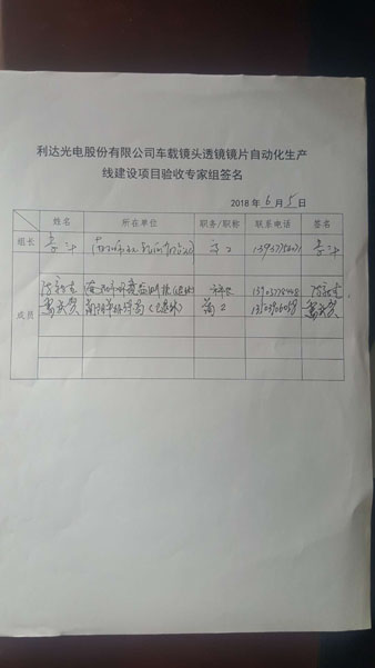 ???? 2018 年 6 月 5 日,利達(dá)光電股份有限公司根據(jù)利達(dá)光電股份有限公司車載鏡頭透鏡鏡片自動化生產(chǎn)線建設(shè)項目竣工環(huán)境保護(hù)驗收監(jiān)測報告,并按照《建設(shè)項目竣工環(huán)境保護(hù)驗收暫行辦法》,嚴(yán)格按照國家有關(guān)法律法規(guī)、建設(shè)項目竣工環(huán)境保護(hù)驗收技術(shù)規(guī)范/指南、本項目環(huán)境影響評價報告表和審批部門審批意見等要求,主持召開了該公司車載鏡頭透鏡鏡片自動化生產(chǎn)線建設(shè)項目環(huán)境保護(hù)竣工驗收會議。參加驗收會議的有項目建設(shè)單位(利達(dá)光電股份有限公司)、環(huán)評單位(南陽市環(huán)境保護(hù)科學(xué)研究所有限公司)、驗收監(jiān)測報告編制單位(鄭州譜尼測試技術(shù)有限公司)的領(lǐng)導(dǎo)、代表及邀請的專家共計 6 人,會議成立了項目竣工環(huán)境保護(hù)驗收組(名單附后),負(fù)責(zé)項目的驗收工作。
